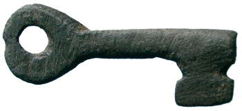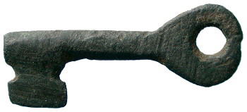 Medieval Bronze Casket Key. A copper-alloy casket key with circular shaped handle. 13th-14th Century. Lincolnshire. 35mm long. Complete. |