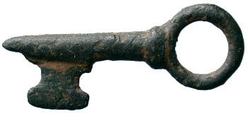 Medieval Bronze Casket Key. A copper-alloy casket key with circular shaped handle. 13th-15th Century. Lincolnshire. 36mm long. Complete. |