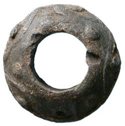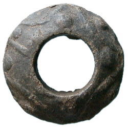 Medieval Decorated Spindle Whorl. A biconical cast lead spindle whorl. Decorated on both sides with moulded lines and pellets. 26.6g. 12th-15th century. Lincolnshire. 24mm x 11mm. |