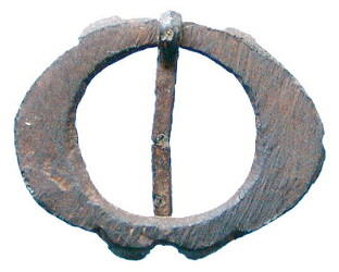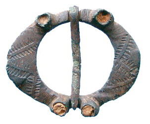 Medieval Ring Brooch. A copper alloy ring brooch of flat section, decorated with four raised cups, three of which still contain the white paste. 13th - 14th century. Nottinghamshire. 20 mm diameter. Complete with working pin. |