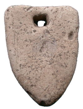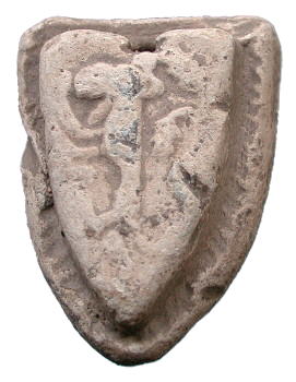 Medieval Trade Weight. A shield shaped lead trade weight, decorated with a lion rampant on a raised stepped shield. Suspension hole at 12 o'clock. 61.5g. 14th-16th Century. Nottinghamshire. 35mm x 26mm x 12mm. |