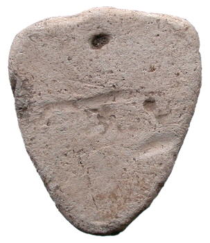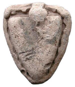 Medieval Trade Weight. A shield shaped lead trade weight, the decoration consisting of a raised stepped shield. Suspension hole on the rear at 12 o'clock. 125.7g. 14th-16th Century. Nottinghamshire. 48mm x 40mm x 12mm. |