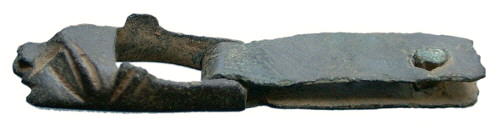 Medieval Looped Clasp and Plate. A copper-alloy single loop clasp and plate. The clasp has a moulded zoomorphic head - possibly a lion or a dog - facing outwards. Behind this is a plate complete with single rivet. Circa 14th century. Lincolnshire. 45 mm long. |