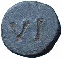 Tudor and Later. Bullion Weight. A circular bullion weight 'VI' mark stamped on one side. 3 grams. Circa 1600 - 1850. 13mm x 3mm. The VI would indicate the denomination - six pennyweight. |