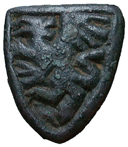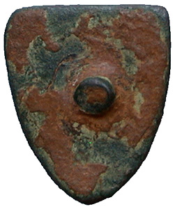 Medieval Heraldic Stud. A Copper alloy shield shaped heraldic stud, the coat of arms consists of a Griffin standing left with head turned back. 13th-14th Century. East Yorkshire. 17 mm x 15 mm. |