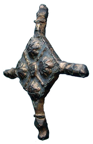 Medieval Heraldic Mount. A cross shaped bronze heraldic mount. The centre section is divided into quarters, with an eight petalled flower in each angle on a blue enamelled background. The four protruding arms are decorated with animal head terminals. The whole piece is gilded, much of which still remains. 13th-14th Century. North Nottinghamshire. 45mm x 44mm. |