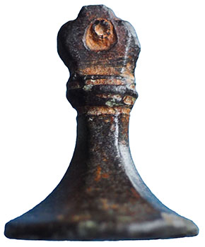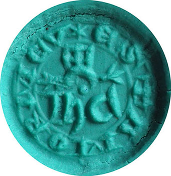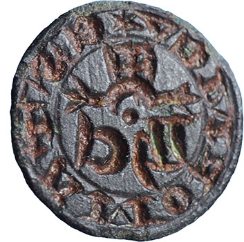 Medieval Bronze Stamper Seal Matrix. A good quality bronze stamper type seal matrix inscribed with IHC in the centre and EST AMOR MEV around which translates as "Jesus is my love". 13th-14th century. Found near Oakham in the county of Rutland. 19 mm diameter by 23 mm high. |
