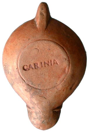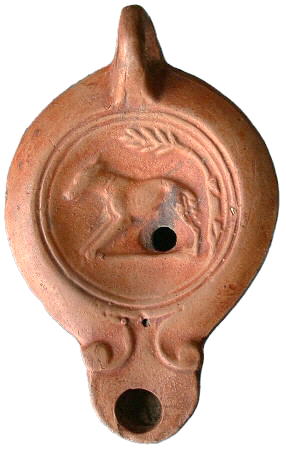 Roman. Oil Lamp. A reddish washed oil lamp with pierced handle and scroll work nozzle, the discus decorated with an animal (a fold or hunting dog) under a palm tree. "CABINIA" markers mark on base. 1st Century BC-AD. North Africa. 107 mm long. No damage, complete and in good condition. |