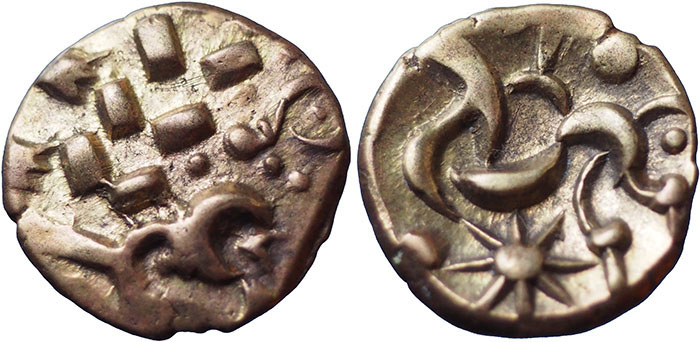 CORIELTAUVI. SOUTH FERRIBY. Au Stater. Abstract head of Apollo right. ® Disjointed horse left, anchor' above, eight pointed star below and pellet below tail. 5.5g. Spink # 390. Perfect metal, as struck with sharp detail. |