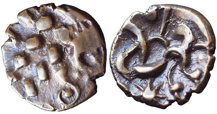 CORIELTAUVI. SOUTH FERRIBY. Au Stater. Abstract head of Apollo right. ® Disjointed horse left, anchor' above, star below. 5.7g. Spink # 390. Circa 40 BC - AD 30. This coin CCI 04.1006. 19mm. |