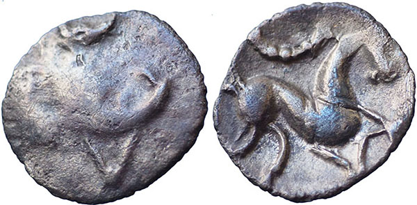 CORIELTAUVI. Boar / Horse type II. Ar Unit. Stylised boar right, ring of pellets above. ® Horse right, pellet under tail, ring of pellets above. 1.1g. Spink # 397. BMC 3214-3227. 14.5mm. |