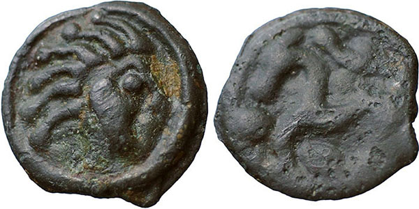 GAUL, SENONES. Cast Potin (18mm). Head right with six locks of hair. ® Horse left, pellets around. 4.3g. Circa 1st Century BC. |