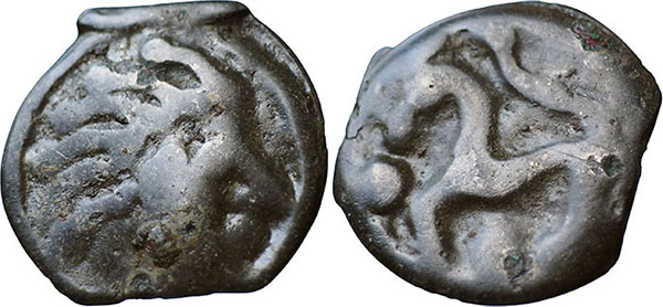 GAUL, SENONES. Cast Potin (18mm). Head right with six locks of hair. ® Horse left, pellets around. 3.3g. Circa 1st Century BC. |