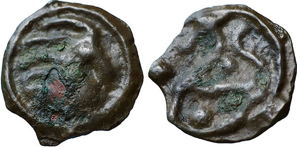 GAUL, SENONES. Cast Potin (18mm). Head right with six locks of hair. ® Horse left, pellets around. 3.3g. Circa 1st Century BC. |
