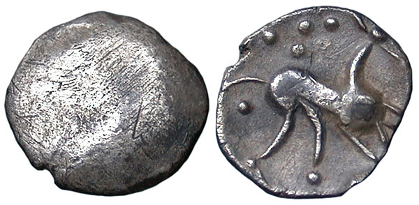 CORIELTAUVI. Boar Horse type III. Ar Unit. Blank. ® Horse right ring of pellets above and single pellet below tail. 1.2g. Spink # 398. |