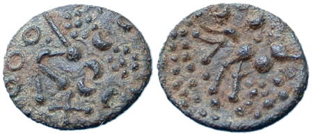 DOBUNNI. Regular Issue. Ae Unit. Ae Unit. Abstract celticized head right, groups of pellets, crescents and cross before. ® Horse right, V below tail, groups of pellets and crescents around. 0.9g. Spink # 377. BMC 3005-3011. Rare. |