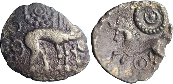 CORIELTAUVI. Boar / Horse type I. Ar Unit. Boar right, curly tail, ‘spear’ in shoulder, ring and pellet motifs above and behind, various symbols around. ® Realistic horse left with ring and pellet motifs above and below. 1.2g. Spink # 396. |
