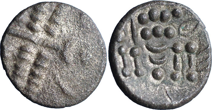 DUROTRIGES. Base Silver / Billon Stater. Abstract head of Apollo. ® Crude disjointed horse with three tails standing left on ground line, large group of pellets and coffee bean above, single pellet below. 3.3g. Spink # 366/7. |