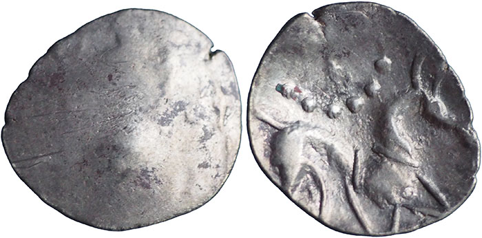 CORIELTAUVI. Boar Horse type III. Ar Unit. Blank. ® Horse right ring of pellets above. 1.1g. Spink # 398. |