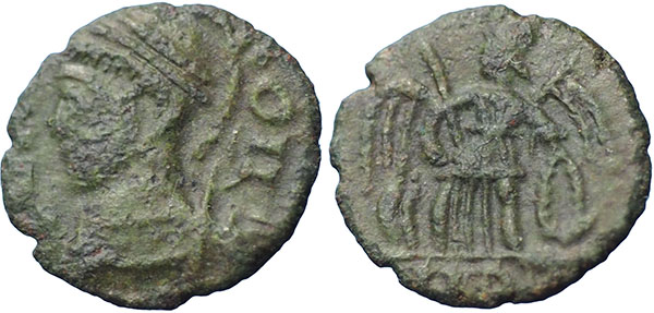 BARBAROUS. Æ (12 mm). Helmeted bust of Constantinopolis left. ® Victory standing left, right foot on prow, holding sceptre and leaning on shield. Mintmark below. Circa 4th Century AD. Copy of commemorative Constantinopolis type. |