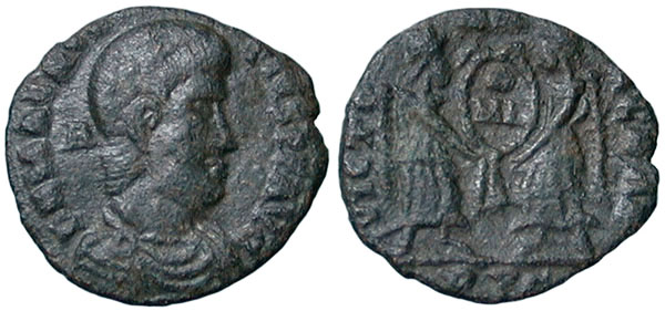 BARBAROUS. Ae 15 mm. Bare head right, A behind. ® Two Victories standing facing each other holding inscribed shield. Circa 4th Century AD. Copy of Magnentius VICTORIAE DD NN AVG ET CAE type. |