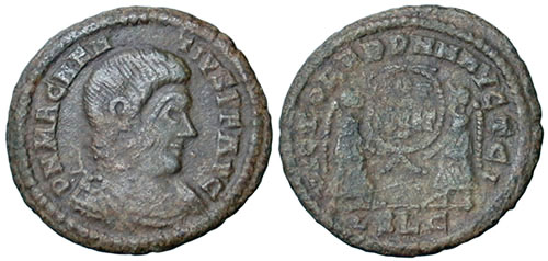 BARBAROUS. Ae 17 mm. Bare head right. ® Two Victories standing facing each other holding inscribed shield. Circa 4th Century AD. Copy of Magnentius VICTORIAE DD NN AVG ET CAE type. |