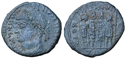 BARBAROUS. Ae 14 mm. Laureate head left. ® Two soldiers standing facing, holding spears, standards in between. Circa 4th Century AD. Copy of Constantine GLORIA EXERCITVS type. UK find. |
