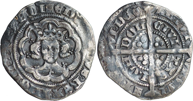 EDWARD III. 1327-1377. Halfgroat. Fourth coinage. Pre-treaty period. Series C (1351 - 1352). Initial mark, cross 1. London. ED[WAR]DVS REX ANGLI Z FRANC, crowned bust facing within a tressure of arches. ® POSVI DEV ADIVTORE M; CIVITAS LONDON, long cross pattée dividing legends; three pellets in each angle. Spink # 1574. North 1148. 23mm. |