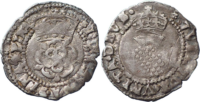 JAMES I. 1603-1625. Halfgroat. Second coinage (1604-1619). I D G ROSA SINE SPINA, rose with large crown above. ® TVEATVR VNITA DEVS, thistle with crown above. mm Lis (1604-5). Scratch in field on reverse, old cabinet tone. |