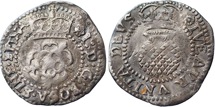 JAMES I. 1603-1625. Halfgroat. Second coinage (1604-1619). I D G ROSA SINE SPINA, rose with large crown above. ® TVEATVR VNITA DEVS, thistle with crown above. mm Rose (1605-6). Spink # 2659. Stress mark in field on reverse, old cabinet tone. |