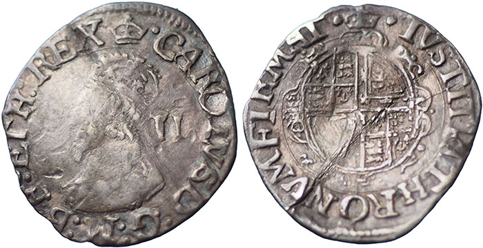 CHARLES I. 1625-1649. Halfgroat. Tower mint under King. Group D, fourth bust, type 3a1, no inner circles. ® Rounder shield. mm Crown. Spink # 2831. Creased from 11 to 5 o'clock. |