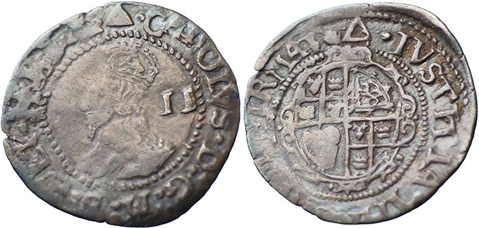 CHARLES I. 1625-1649. Halfgroat. Tower mint under King. Group D, fourth bust, type 3a2-3, inner circles on both sides. mm Triangle. Spink # 2832. |