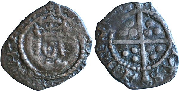 Halfpenny. Second coinage (1526-44). Facing bust, h D G ROSA SIE SPIA. London. Spink # 2356. |
