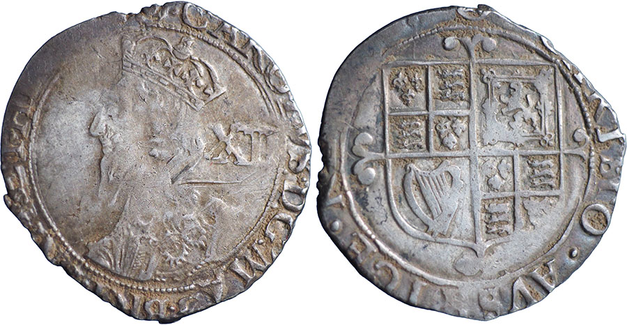 CHARLES I. 1625-1649. Shilling. Tower mint under Parliament. Group F, sixth large 'Briot's bust, type 4.4, with stellate lace collar, double-arched crown. ® Square-topped shield over cross moline. mm (R). Spink # 2800. North 2231-32. |