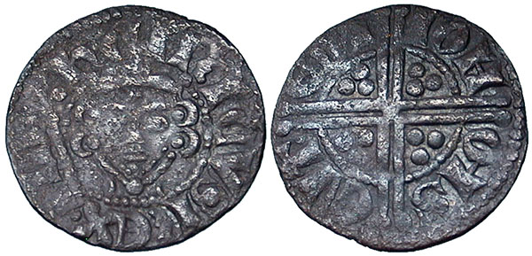 HENRY III. 1216-1272. Penny. Class Vg. IOH OH SENTEDM (Bury St Edmunds). Spink # 1373. North 997. Eaglen # 339 (same dies). Note: OH, EN & DM ligate. This coin illustrated in the The Long Cross Pennies of Henry III web site. Scarce. |
