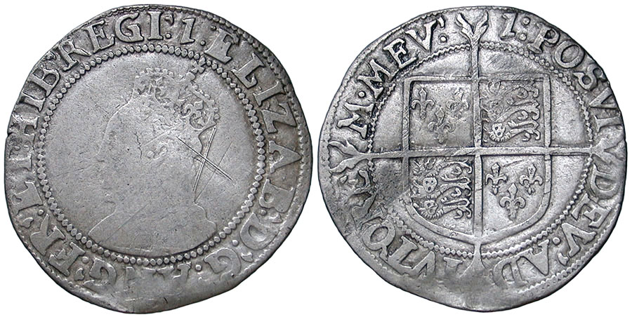 ELIZABETH I. 1558-1603. Shilling. Seventh issue (1601-1602). Without rose or date, ear shows. mm 1 (1601). Spink # 2584. |