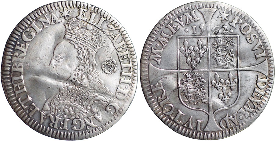ELIZABETH I. 1558-1603. Sixpence. Milled coinage (1561-1571). Large broad bust, elaborately decorated dress, small rose, cross pattee on reverse. 1562 mm star. Spink # 2597. Creased from 9 to 5 o'clock. |