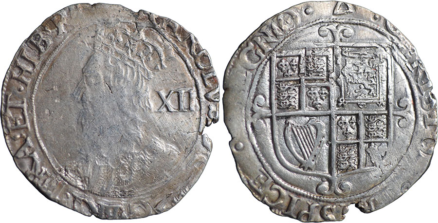 CHARLES I. 1625-1649. Shilling. Tower mint under King. Group F, sixth large 'Briot's bust, type 4.4, with stellate lace collar, double-arched crown. ® Square-topped shield over cross moline. mm Triangle. Spink # 2799. |