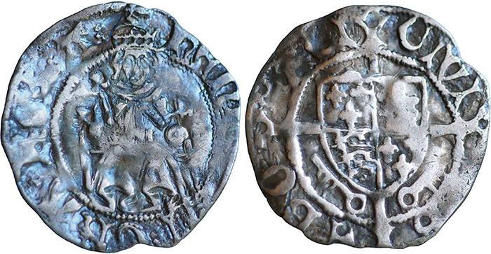 HENRY VII. 1485-1509. Penny. Sovereign type. York, Archbishop Rotherham. Single pillar. ® Keys below shield. Spink # 2236. Small flan crack at 12 o'clock. |