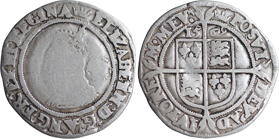 ELIZABETH I. 1558-1603. Sixpence. Third and Fourth issue (1561-1577). Intermediate bust 4B, ear shows. 1569 mm Coronet. Spink # 2562. |