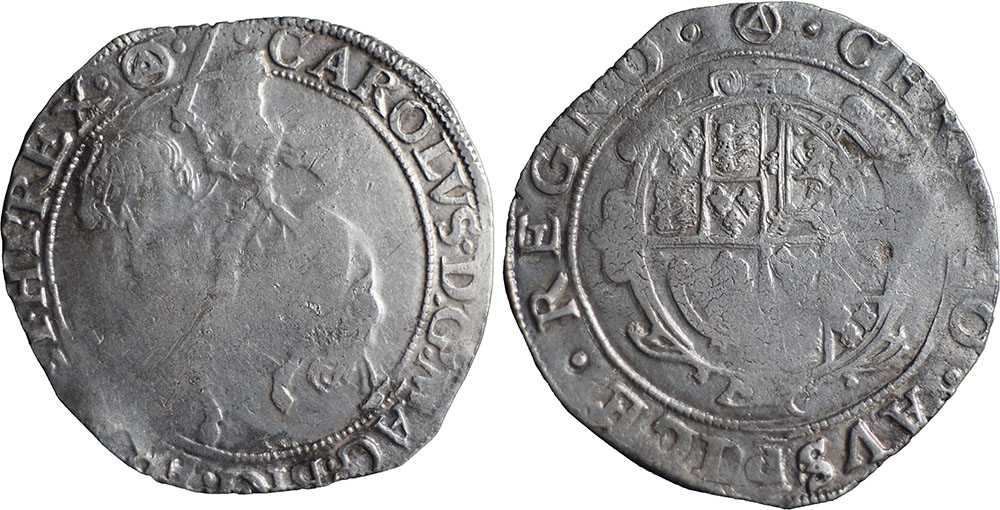 CHARLES I. 1625-1649. Halfcrown. Group IV. Fourth horseman, type 4, foreshortened horse. ® Oval garnished shield. mm Triangle in circle. Spink # 2779. |