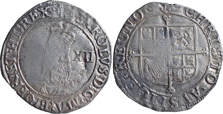 CHARLES I. 1625-1649. Shilling. Tower mint under King. Group E, fifth "Aberystwyth" bust, type 4.3, smaller bust, single arched crown, large XII. ® Square topped shield over cross moline. mm Anchor. Spink # 2796. |