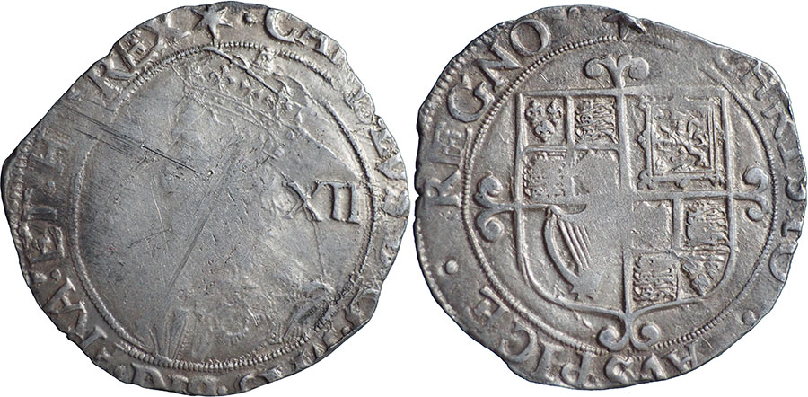 CHARLES I. 1625-1649. Shilling. Tower mint under King. Group F, sixth large 'Briot's bust, type 4.4, with stellate lace collar, double-arched crown. ® Square-topped shield over cross moline. mm Star. Spink # 2799. |