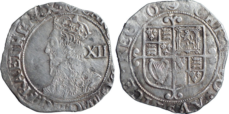 CHARLES I. 1625-1649. Shilling. Tower mint under King. Group F, sixth large 'Briot's bust, type 4.4, with stellate lace collar, double-arched crown. ® Square-topped shield over cross moline. mm Triangle in circle. Spink # 2799. |
