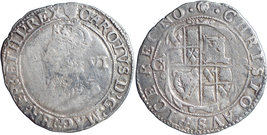 CHARLES I. 1625-1649. Sixpence. Tower mint under King. Group D, fourth bust, type 3, with falling lace collar, inner circles. medium bust. ® Garnished oval shield with CR at sides. mm Harp. Spink # 2811. |