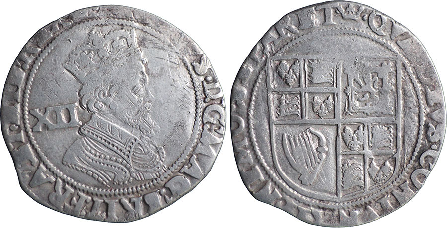 JAMES I. 1603-1625. Shilling. Second coinage (1604-1619). Fifth bust, longer hair, single arched crown. mm Coronet (1607/9). Spink # 2656. |