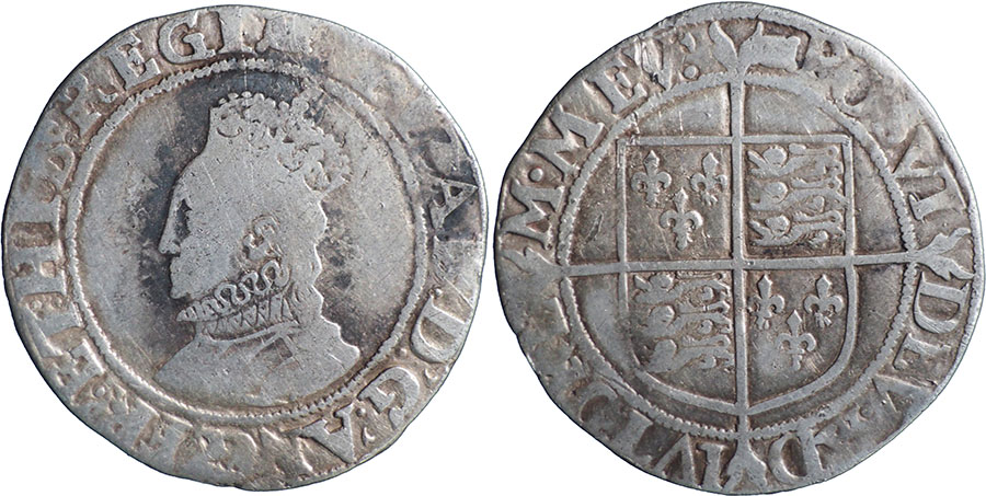 ELIZABETH I. 1558-1603. Shilling. Sixth issue (1582-1600). Without rose or date, ear shows. mm Woolpack (1594-96). Spink # 2577. |