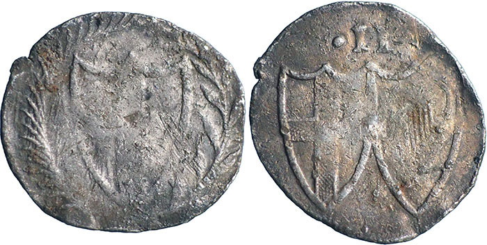 COMMONWEALTH. 1649-1660. Halfgroat. Shield inside wreath. ® II above shields. Spink # 3221. |