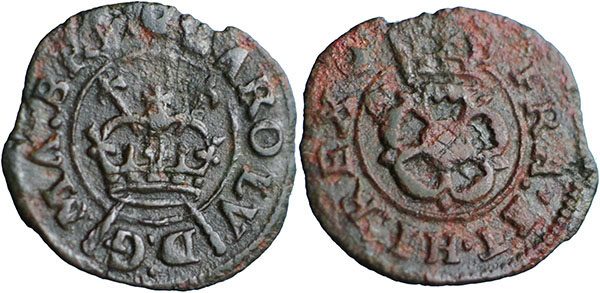 CHARLES I. 1625-1649. Rose Farthing. CAROLV D G MA BRI, crown with two sceptres in saltire. ® FRA ET HI REX, crowned rose. Mint mark crescent both sides. Spink 3206. 13 mm. |