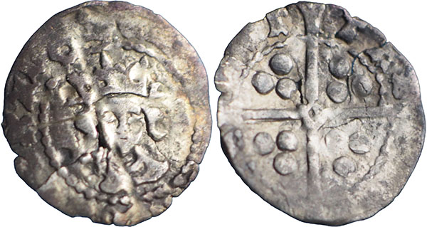 EDWARD IV (Second Reign). 1471-1483. Halfpenny. Durham. E[DWARD] DEI GRA RE[(X)], crowned bust facing; V to left of neck. ® CIVITAS [DER]AM, long cross pattée with three pellets in each angle; D in centre. Spink # 2143. North 1699. Withers Durham Type 4a. 13mm. A very rare Edward IV halfpenny struck at the Durham ecclesiastical mint of Bishop William Dudley from dies made locally under special permission granted in 1473. Initial mark, rose. The E of RE(X) is misaligned (markedly low) in relation to the other letters of the obverse legend. Cracked in two places (see image) but in a stable condition. |